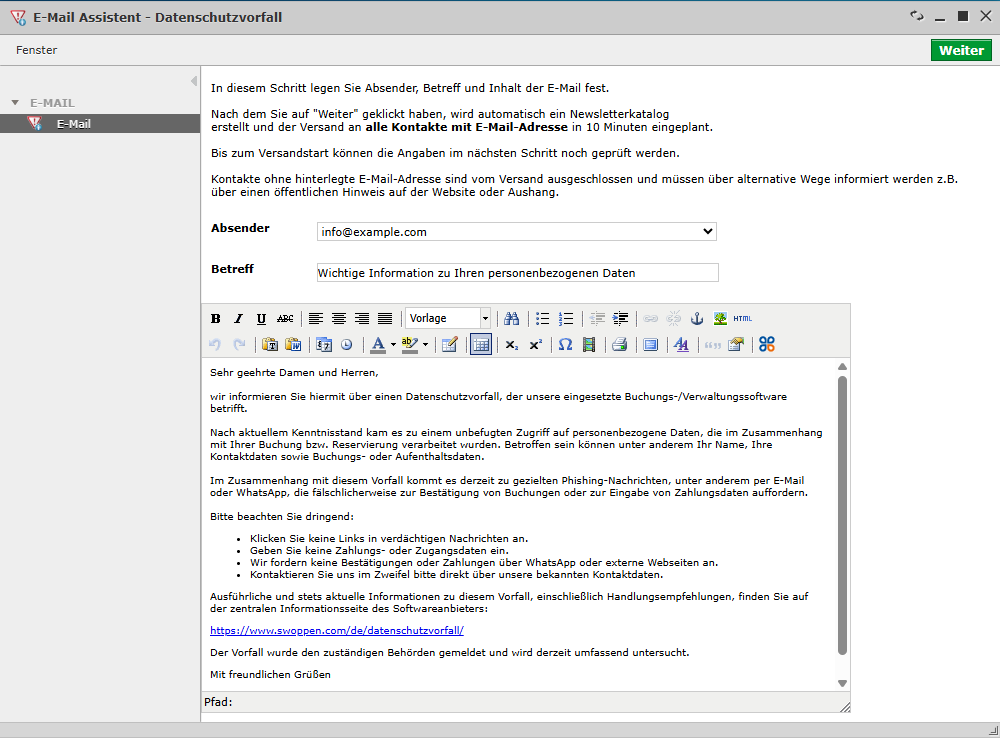 Mit dem E-Mail-Assistenten „Datenschutzvorfall“ können Sie Ihre Gäste schnell und strukturiert über einen sicherheitsrelevanten Vorfall informieren. Der Assistent führt Sie Schritt für Schritt durch die Erstellung und den geplanten Versand der Benachrichtigung.